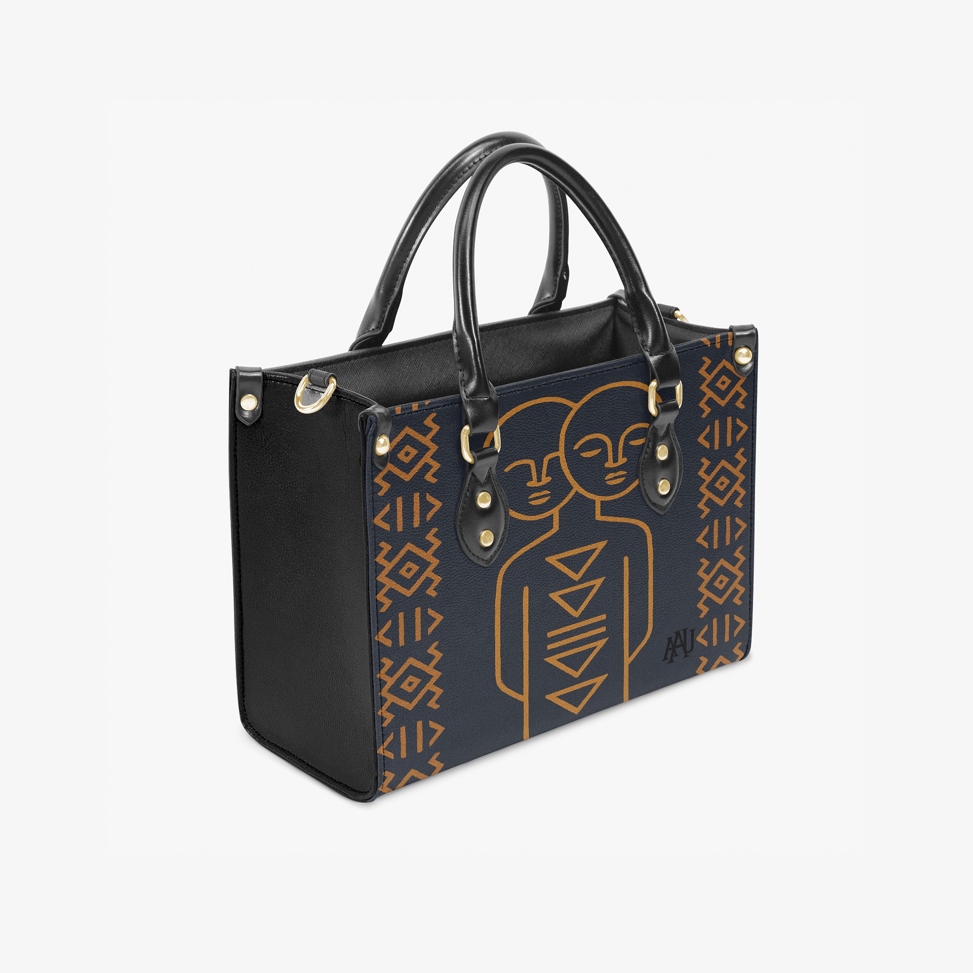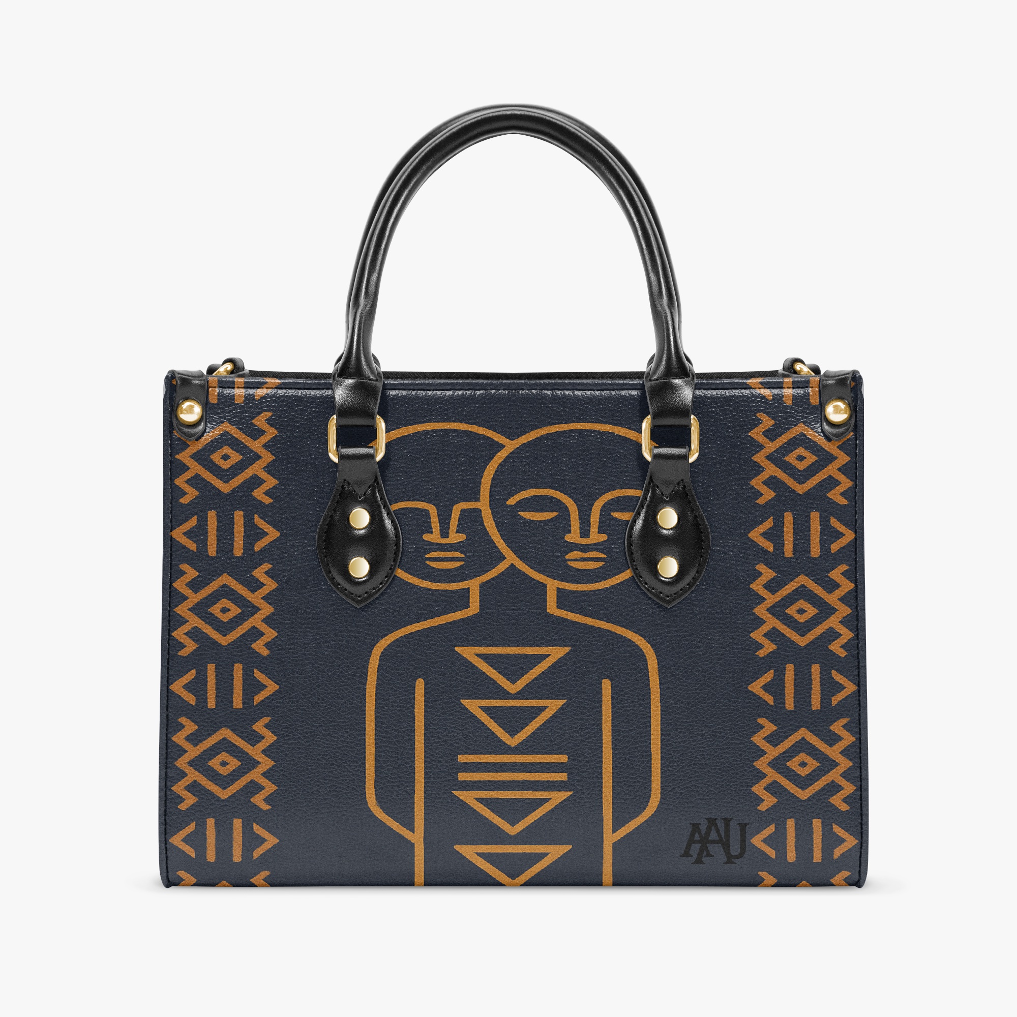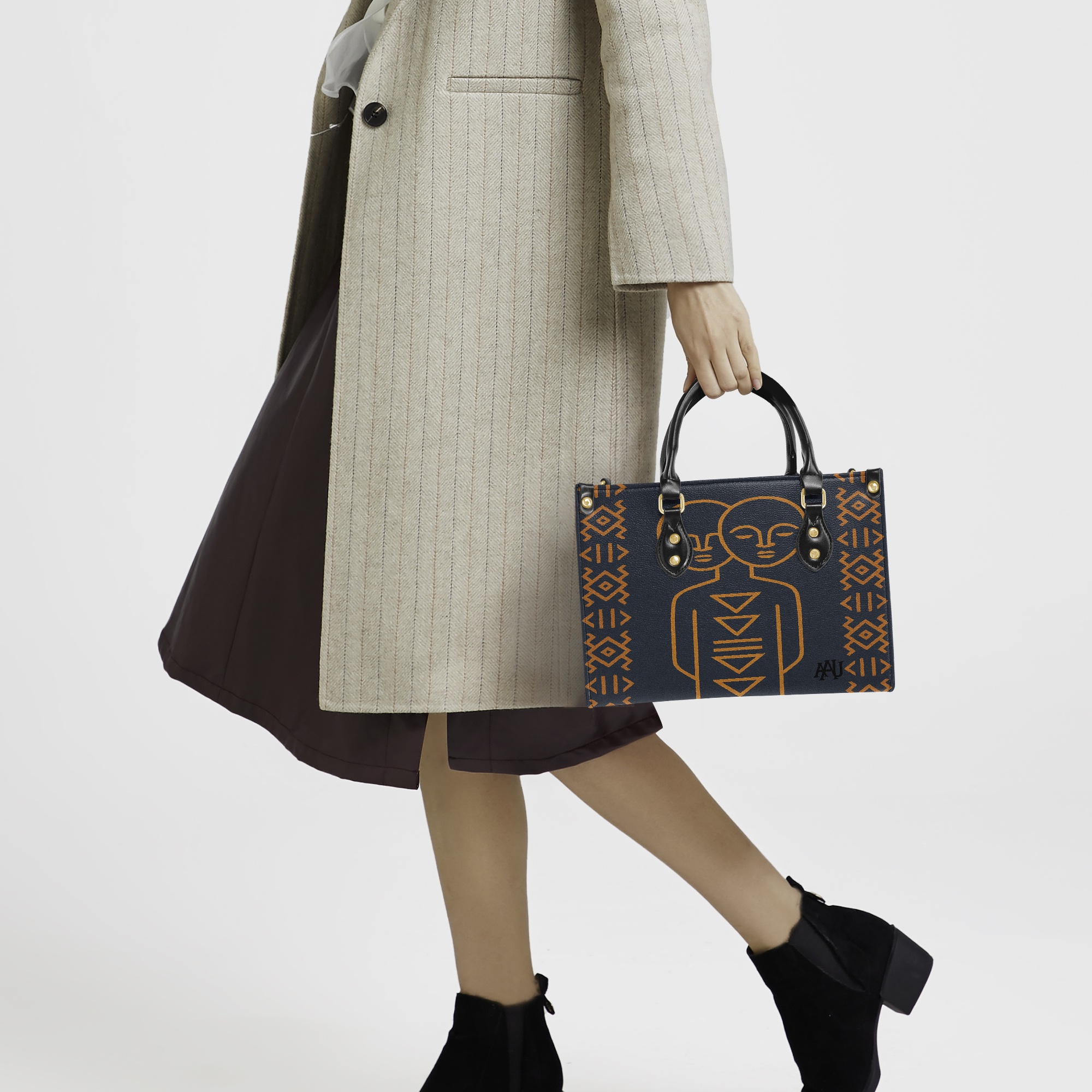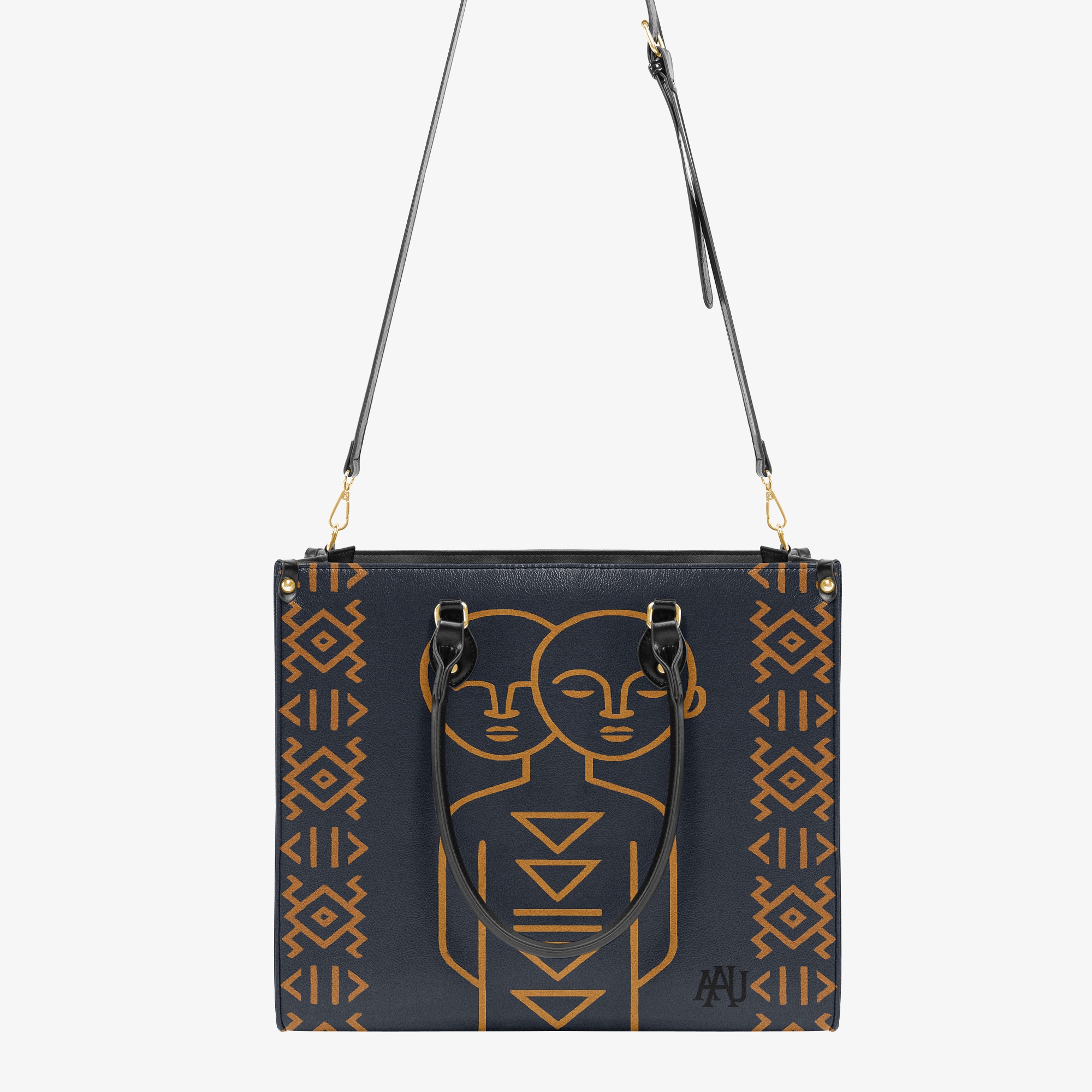 The central motif features a dual-faced ancestral figure—symbolising unity and lineage—framed by traditional geometric patterns inspired by West African looms and scarification aesthetics. Rendered in a deep navy and golden ochre palette, the bag balances bold storytelling with refined craftsmanship.
